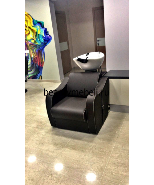 Подстраиваясь под клиента, раковина поднимается и опускается, принимая нужное положение. Стильное основание изготовлено с эргономичной спинкой и удобными мягкими подлокотниками, сиденье – широкое: все для того, чтобы клиенту было максимально комфортно. Боковая часть оформлена элегантным ремешком с пряжкой, по краю материал оформлен качественной строчкой – эти нюансы делают модель красивой и современной, моментально привлекая внимание посетителей.