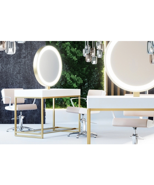 Зеркальное полотно в форме идеального круга с декоративной подсветкой, надёжная порошковая покраска, устойчивая к образованию ржавчины, вместительная столешница для инструментов, мощные металлические подножки с накладками из нержавеющей стали и максимально устойчивые опоры. Уникальное сочетание утонченного дизайна и безукоризненного качества исполнения.
