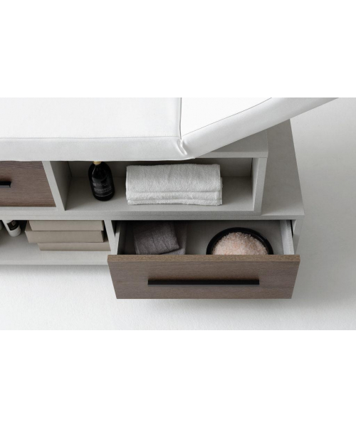 Массажная кушетка "The Wall" - оборудована двумя выдвижными ящиками, выдвижной полкой для косметического оборудования, экспозиционными отсеками для продуктов, большим отсеком для оборудования. Фронтальные ящики оснащены алюминиевыми ручками, отделка свинцово-черная. Регулируемая спинка. Оснащена держателем рулона и деревянными ножками.